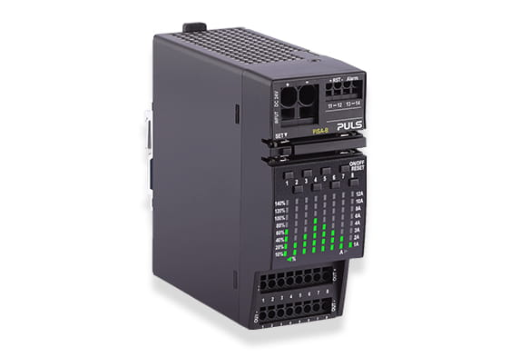 For higher power requirements, the 8-channel PISA-B offers a solution. Channels 1 and 2 are ideal for high capacitive loads up to 100 mF, with a maximum current of 12 A on these channels. Normal loads up to 20 mF can be connected to channels 3-8, with a maximum current of 10 A on these outputs. Slow or fast tripping can be selected for all channels.