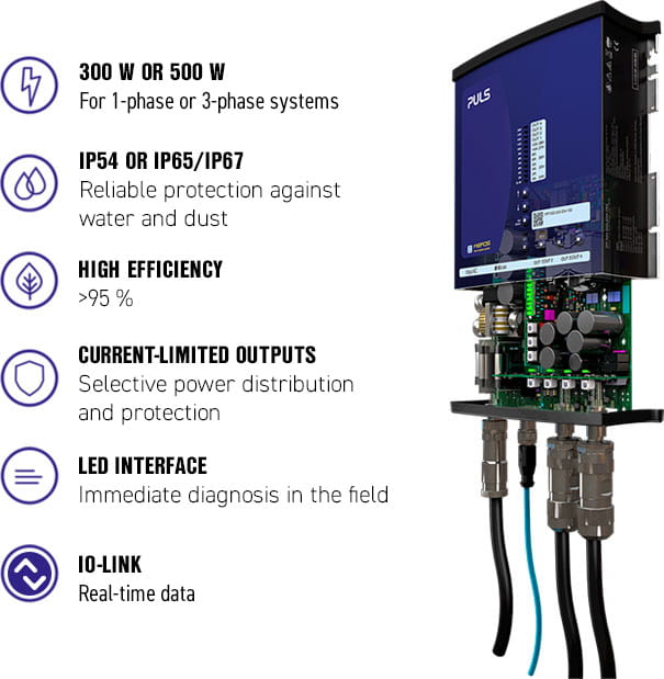 The decentralized FIEPOS power supplies with high protection classes IP54, IP65 or IP67 were developed for flexible use directly in the field.