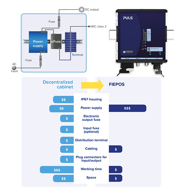 FIEPOS field power supplies make it possible to use shorter cables and smaller cable cross-sections. This not only saves on the costs of copper, but also on the installation work for the cabling. In addition, an all-in-one device can be used instead of several components. This means less effort in managing part numbers and less time effort in installation.